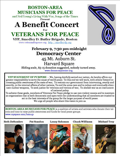 For more information about a February 9th benefit concert for Veterans for Peace by Boston Area Musicians…